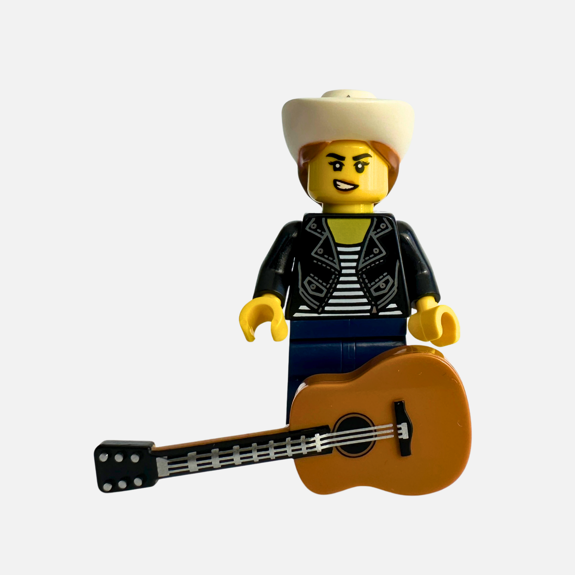 Yee-haw meets rock ’n’ roll. This Country Rocker comes dressed to steal the spotlight with a white cowboy hat, black leather jacket, striped tee, and blue jeans. Armed with her trusty acoustic guitar, she’s ready to twang, shred, or smash her way through any stage.